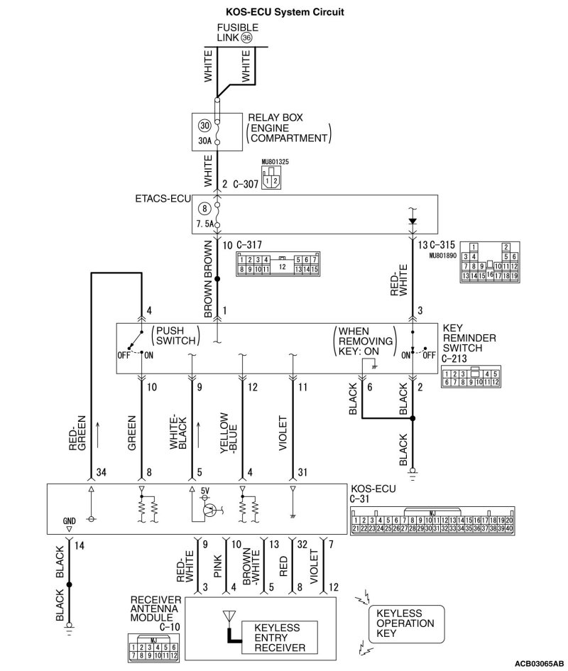 The receiver antenna module receives lock and unlock signals from the keyless operation key, and sends them to KOS-ECU, and further to ETACS-ECU. Also, when ETACS receives signals from the key reminder switch and all the door switches, ETACS-ECU judges them to activate the keyless entry system.