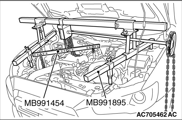 (2) Mount special tool MB991454 to the power steering oil pump bracket and engine hanger, and set it to special tool MB991895 to support the engine and transaxle assembly.