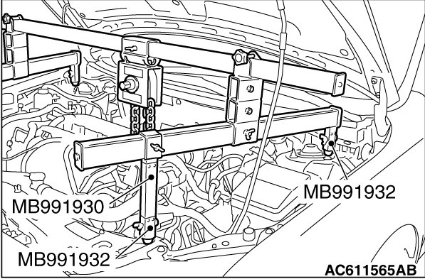 (1) Assemble the special tool MB991928. Set the following parts on the base hanger.