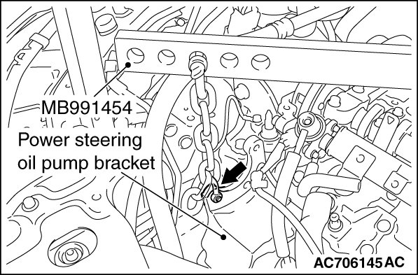 (3) Mount special tool MB991454 to the power steering oil pump bracket and engine hanger, and set it to special tool MB991928 to support the engine and transaxle assembly.