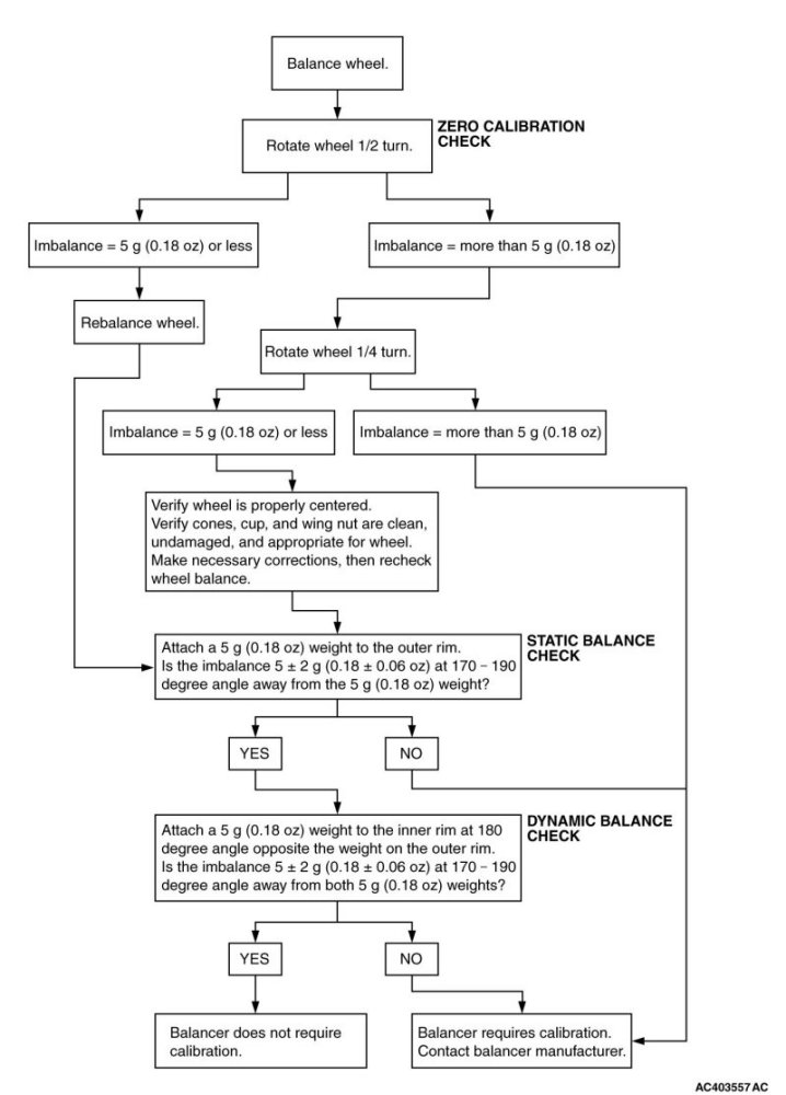 Check your balancer's calibration approximately every 100 balances. Your wheel balancer's instruction manual should include calibration procedures. If the calibration procedures specifically for your balancer are missing, use the generic steps in this section for zero calibration, static balance, and dynamic balance checks. The wheel balancer calibration checks are also described in the flowchart. (Refer to .)