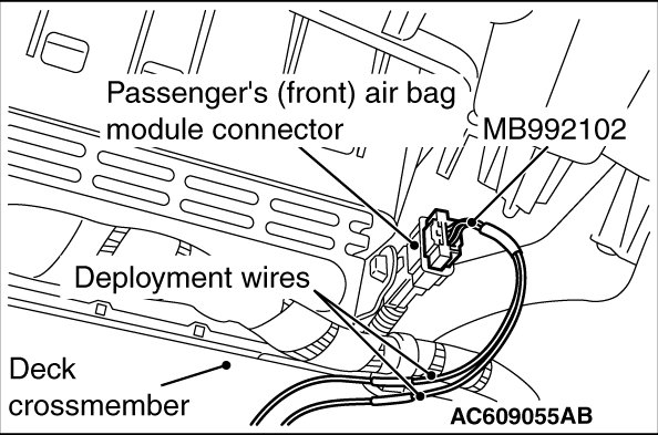 6. Connect the special tool MB992102 to the passenger's (front) air bag module, and then pull out the deployment wire to outside the vehicle.