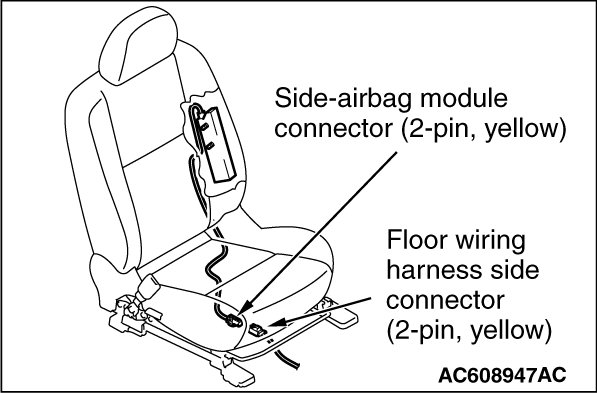4. Disconnect the connections of the side-airbag module connector (two-pin: yellow) and the floor harness side connector (two-pin: yellow).