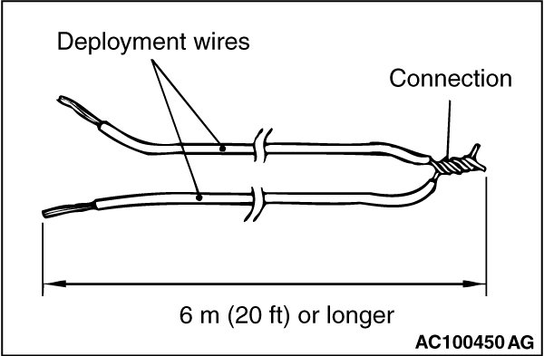 5. Connect deployment wires, each 6 meters (20 feet) or longer, to the two leads of special tool MB992102, and cover the connections with insulator tape. The other ends of the deployment wires should be connected to each other (short-circuited), to prevent sudden unexpected deployment of the air bag module.