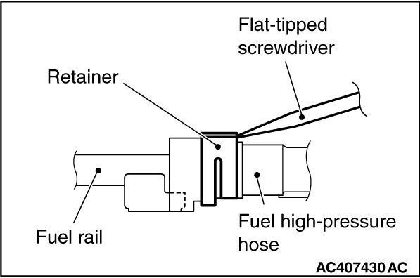 (1) Insert a flat-tipped screwdriver [6 mm (0.24 inch) wide and 1 mm (0.04inch) thick] into the retainer of the fuel high-pressure hose connector.