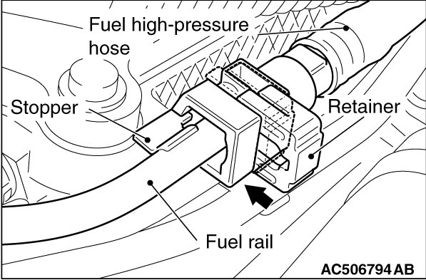 Push in the retainer of the fuel high-pressure hose connector to lock the fuel high-pressure hose and fuel rail.