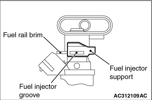 2. Turning the fuel injector assembly to right and left, install it to the fuel rail with care not to damage the O-ring. After the installation, check for its smooth rotation. At this time, check that the projection of the fuel injector assembly is in the center.