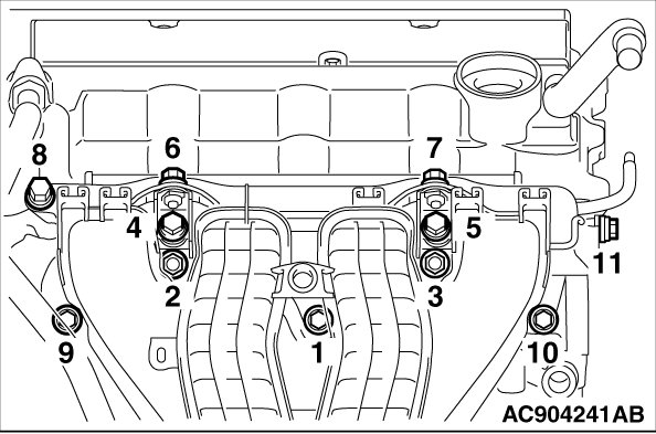 10. Tighten the intake manifold stay mounting bolts Service and Repair).