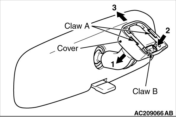 2. Push the claw B toward arrow 2 direction to unlock, and pull out the mirror toward arrow 3 direction.
