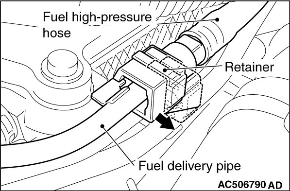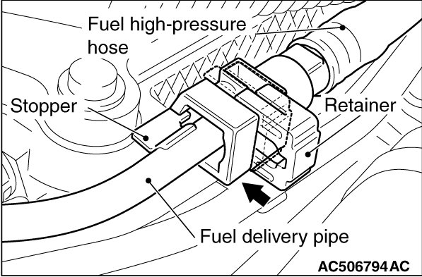When pushing up the retainer of the fuel high-pressure hose connector, pay attention to avoid damage to the retainer.