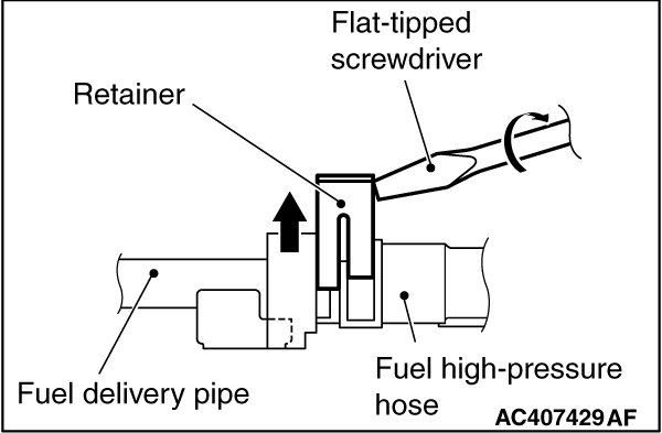 Turn the flat-tipped screwdriver inserted into the retainer by 90 degrees angle to push up the retainer and unlock the fuel high-pressure hose connector.