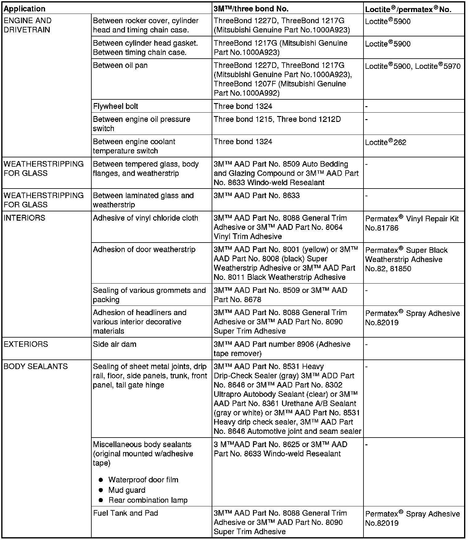 MAIN SEALANT AND ADHESIVE TABLE