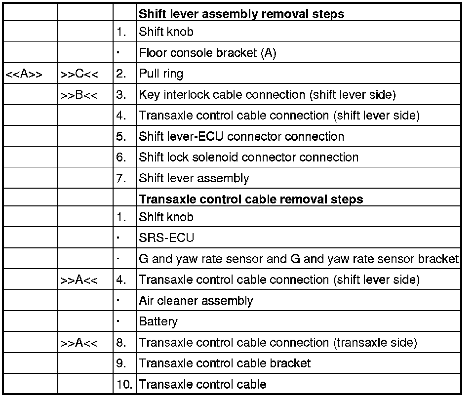 When the transaxle control cable is disconnected, check after the installation that the cable is properly connected, and that the parking lock mechanism operates normally. At this time, do not check by simply using the display on the combination meter and shift indicator panel. Always check according to the procedure below.