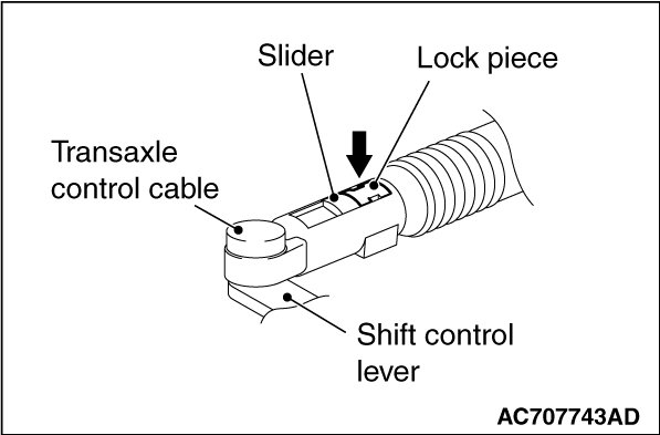 3. Move the slider of the transaxle control cable (transaxle side) tip to the direction A to pull up the lock piece to the direction B.