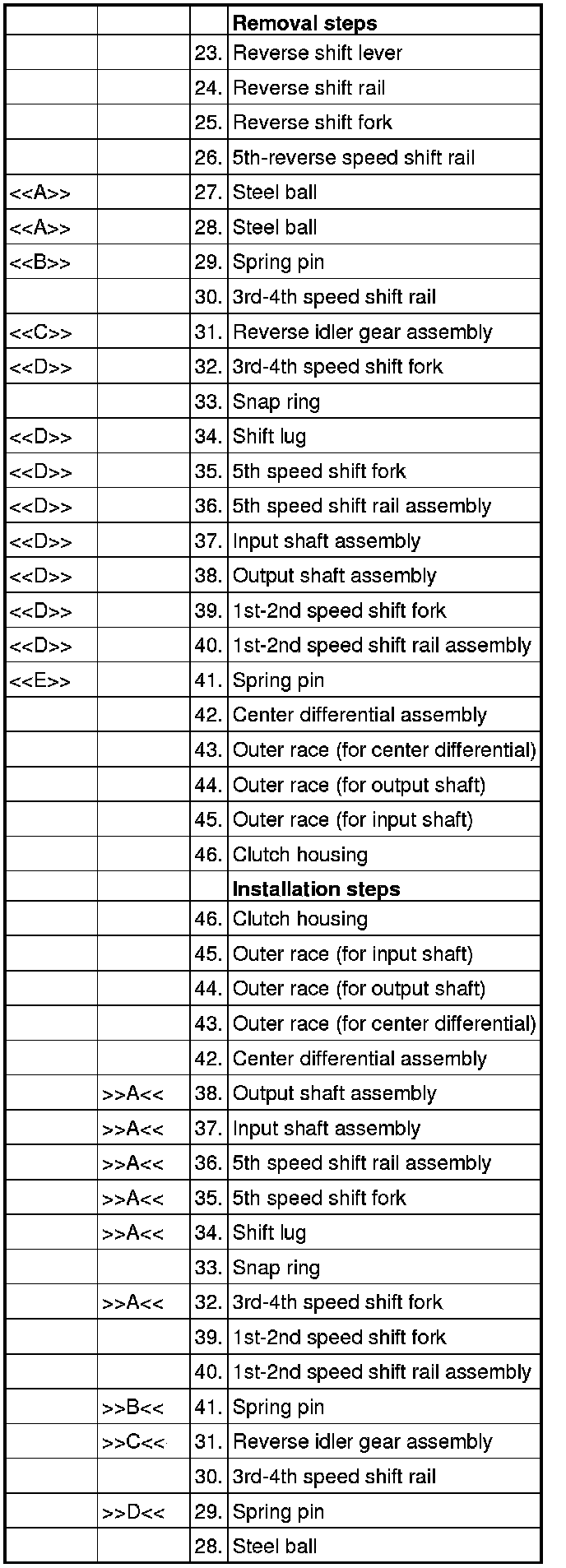 ]]A[[ 3RD-4TH SPEED SHIFT FORK / 5TH SPEED SHIFT FORK / SHIFT LUG / 5TH SPEED SHIFT RAIL ASSEMBLY / INPUT SHAFT ASSEMBLY / OUTPUT SHAFT ASSEMBLY REMOVAL
