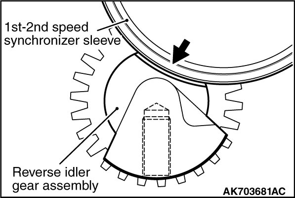 Install the reverse idler gear assembly so that the notch of the reverse idler gear shaft and 1st-2nd speed synchronizer sleeve meet at the illustrated position.