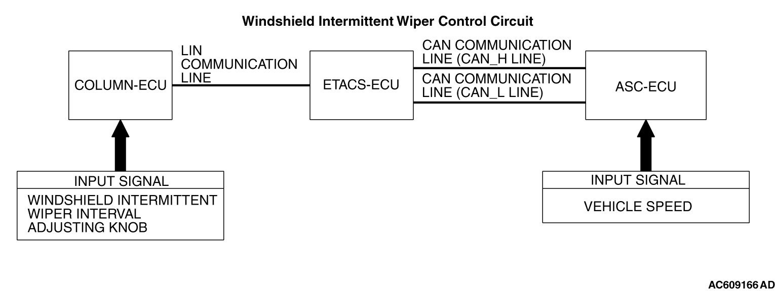 If the windshield intermittent wiper interval is not changed by operating the windshield intermittent wiper interval adjusting knob or according to the vehicle speed, the column switch or the ETACS-ECU may be defective.