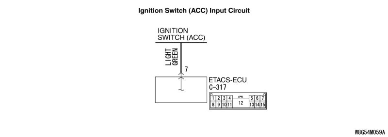 If there is an error to the ignition switch (ACC) input signal, or the ACC relay inside the ETACS-ECU does not operate, the ignition switch (ACC) signal is no longer output to the communication line.