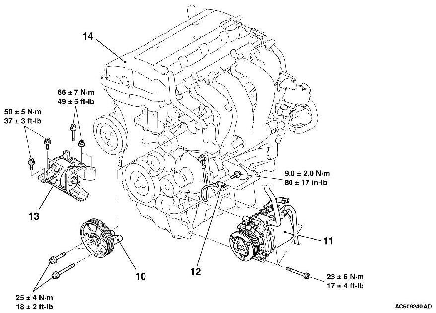 Tighten A/C compressor and clutch assembly mounting bolts to the specified torque in the order of number shown in the illustration.