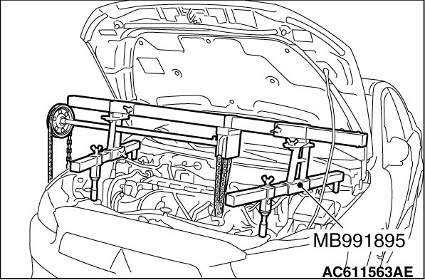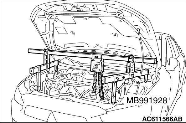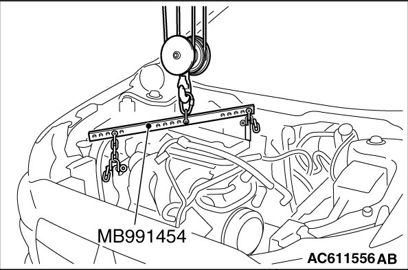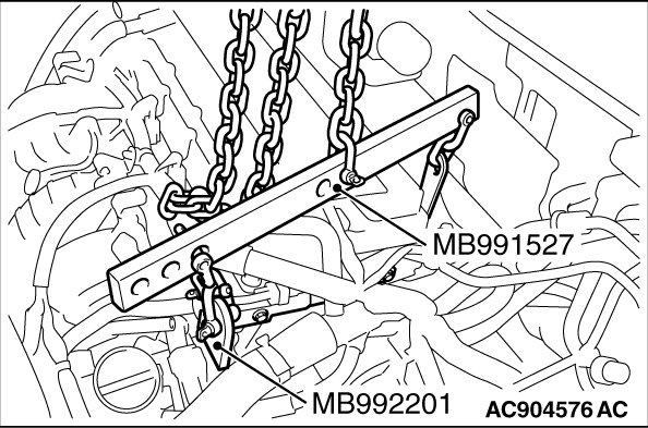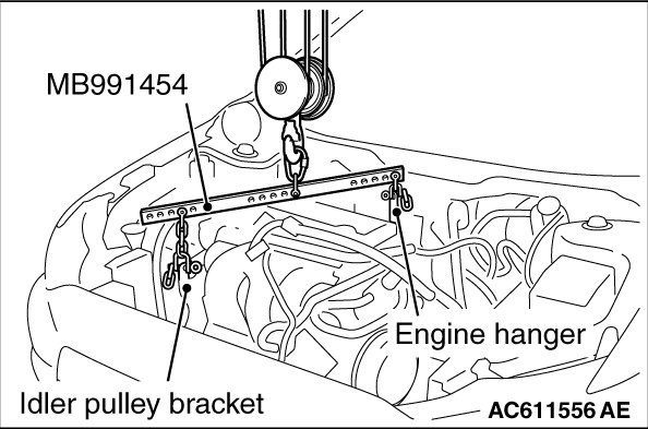 1. Mount the special tool MB991454 to the idler pulley bracket and the engine hanger, and set the chain block.