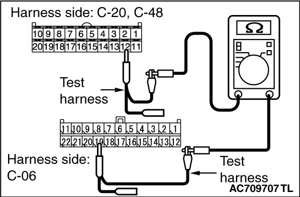 STEP 29. Check the wiring harness between joint connector (CAN1) C-06 and A/C-ECU connector C-20 [vehicles with A/C] or heater control unit connector C-48 [vehicles without A/C] for line-to-line short. Measure the resistance at joint connector (CAN1) C-06.