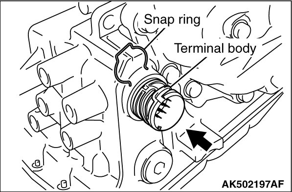 13. Remove the snap ring from the terminal body, and press the terminal body into the transaxle case.