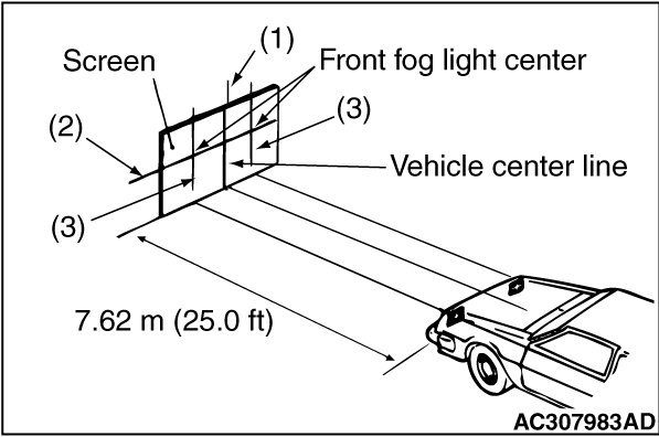 (3) Measure the distance from the center line of the vehicle to the center of each front fog light. Transfer the measurement to the screen. Vertical tape or mark on the screen is for reference to the center line of each front fog light.