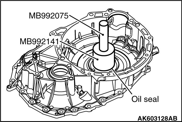 60. Using the special tool MB992140 and MB992075, install the side oil seal on the transaxle case.