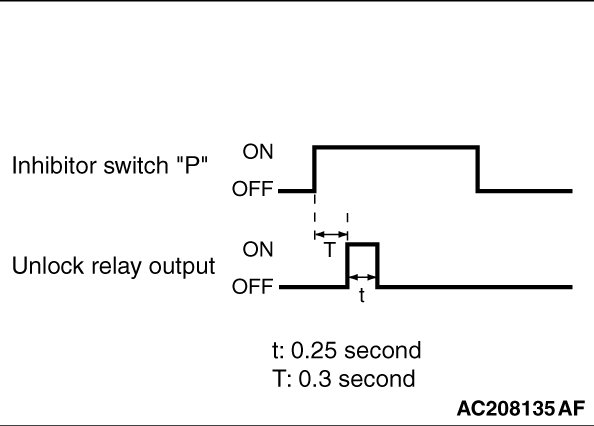 When the selector lever is shifted to the P position with the ignition switch turned ON, the transaxle range switch "P" turns ON, ETACS-ECU turns the unlock relay output ON for 0.25 seconds to unlock all the doors (including the liftgate [LANCER SPORTBACK]).