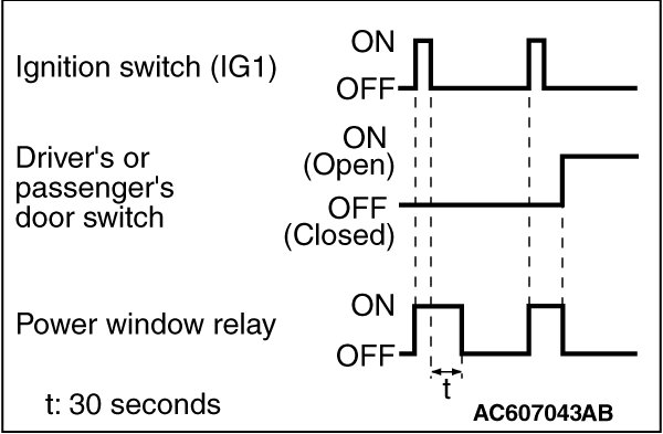 Even after the ignition is switched off, the ETACS-ECU keeps the power window relay activated for approximately 30 seconds, enabling raising or lowering of the power windows by using the power window switches. After approximately 30 seconds, the power window relay is deactivated.