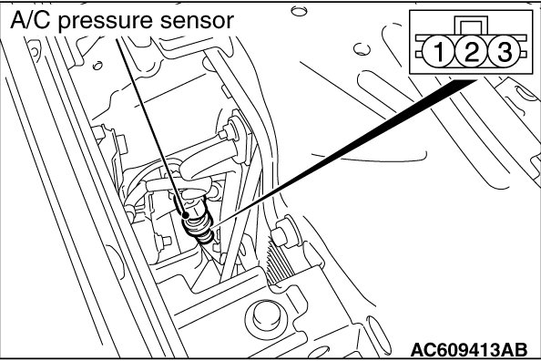 2. Disconnect the A/C pressure sensor connector and connect special tool test harness MB991658 as shown in the illustration.