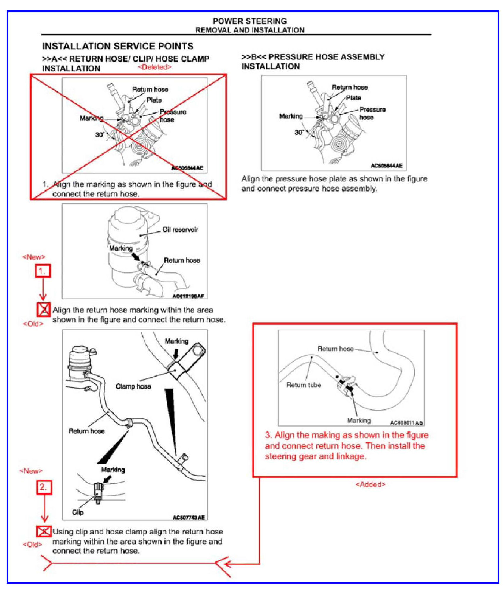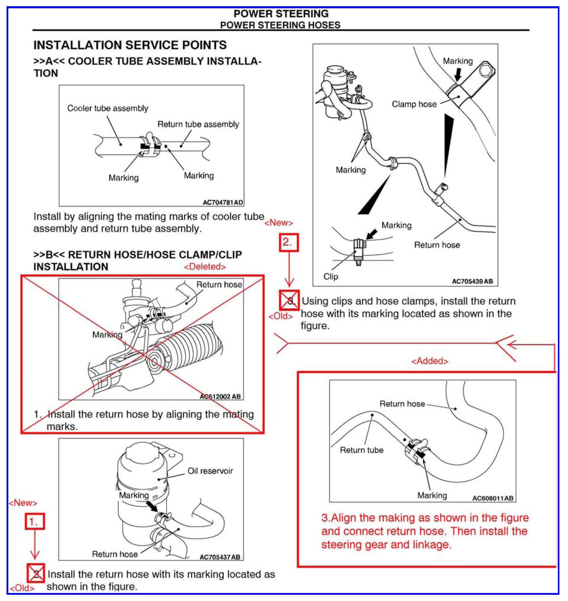 Alignment markings on power steering hoses were discontinued beginning October 1, 2011 production. Due to this change the installation procedure for the return hose is changed. This TSB contains the revised information.