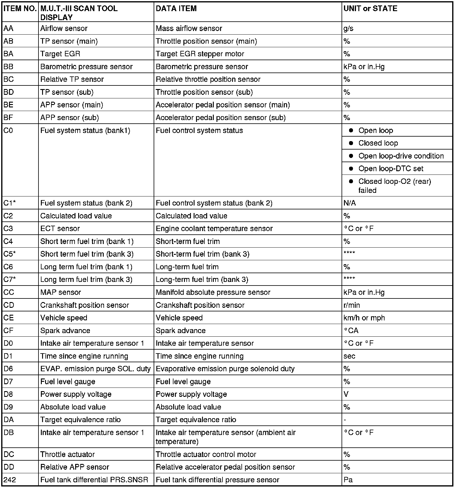 If the sensor connector is disconnected with the ignition switch turned on, the diagnostic trouble code is memorized. In this case, send the diagnostic trouble code erase signal to the ECM in order to erase the diagnostic memory. The 145 diagnostic items are all indicated sequentially from the smallest code number. The ECM records the engine operating condition when the diagnostic trouble code is set. This data is called "Freeze-frame" data. This data can be read by using the scan tool, and can then be used in simulation tests for troubleshooting. Data items are as follows: