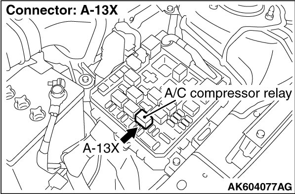 - Open or shorted A/C compressor relay circuit, harness damage or connector damage.