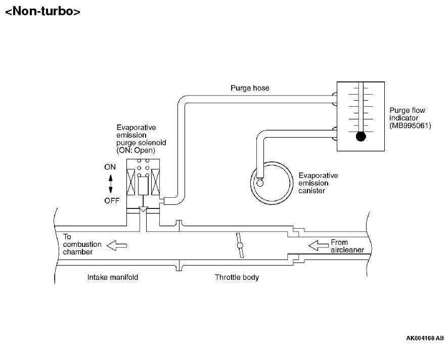 1. Disconnect the purge hose from the evaporative emission (EVAP) purge solenoid, and connect special tool MB995061 between the EVAP purge solenoid and the purge hose.