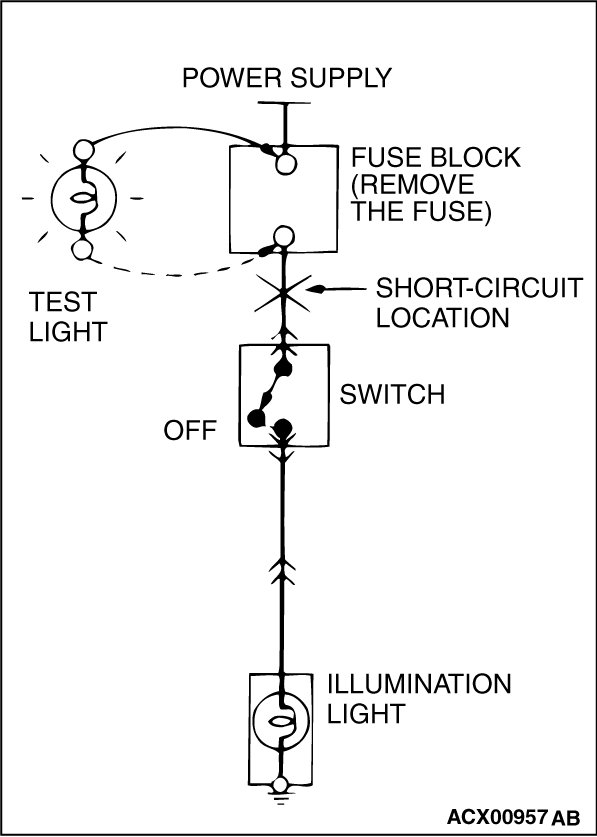 STEP 1. Remove the blown fuse and connect the test light across the fuse terminals (Circuit switch: OFF).