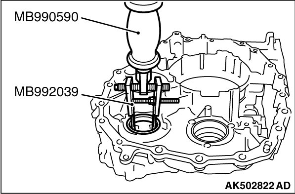 54. Using the special tools MB990590 and MB992039, remove outer race of the differential side bearing from the transaxle case.