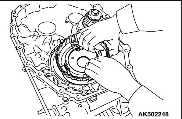 69. Using the special tool MB992139, compress the return spring, and remove the snap ring from the transaxle case.