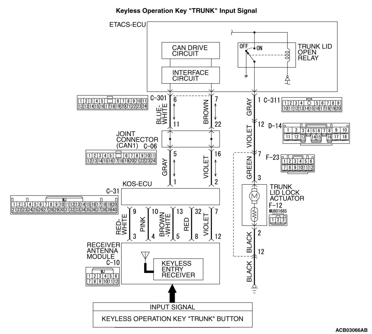 The receiver antenna module receives trunk signals from the keyless operation key, and sends them to KOS-ECU, and further to ETACS-ECU.