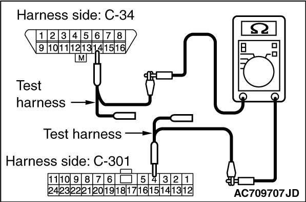 STEP 5. Check the wiring harness between data link connector C-34 and ETACS-ECU connector C-301 for line-to-line short. Measure the resistance at data link connector C-34.