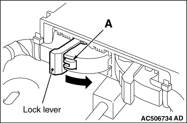 While pushing the part "A" indicated in the figure of the harness side connector, turn the lock lever to the direction of the arrow to release the lock lever.