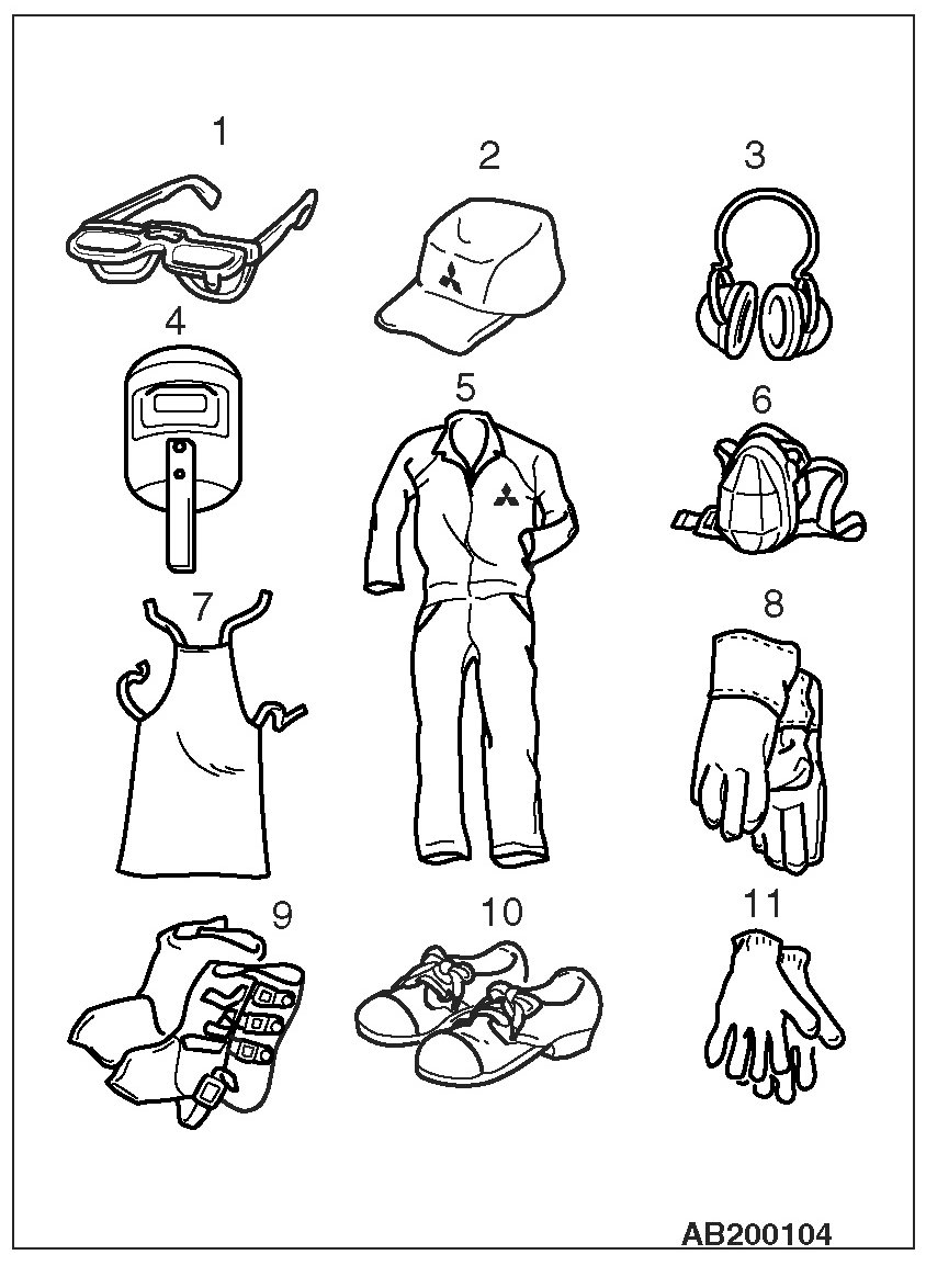 During body repair work a work suit a work cap and safety shoes should be worn at all times. Depending on the work being done safety glasses gloves ear protectors a dustproof mask etc. should also be worn as needed