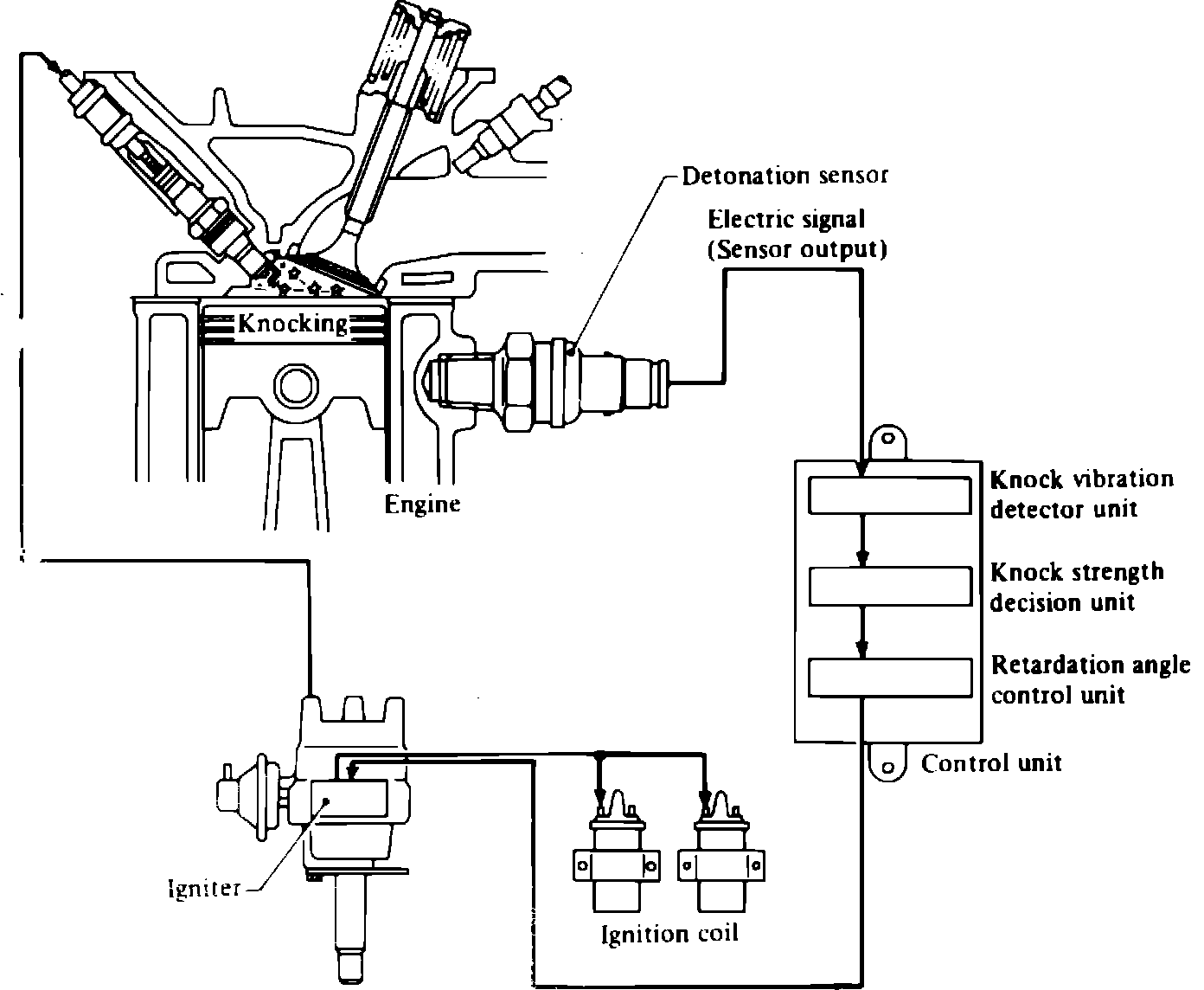 This system, Fig. 44, incorporates a detonation sensor to monitor detonation in each combustion chamber and send a corresponding signal to the control unit. The detonation control unit, located under the driver's seat, varies ignition timing to minimize detonation.