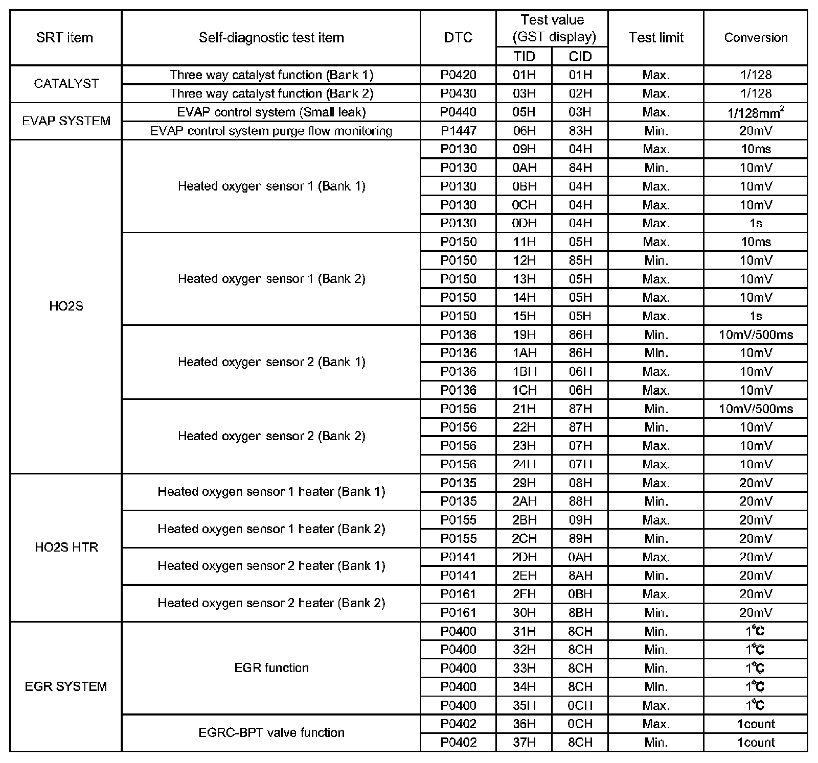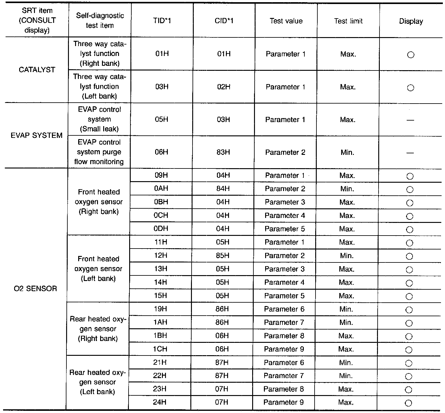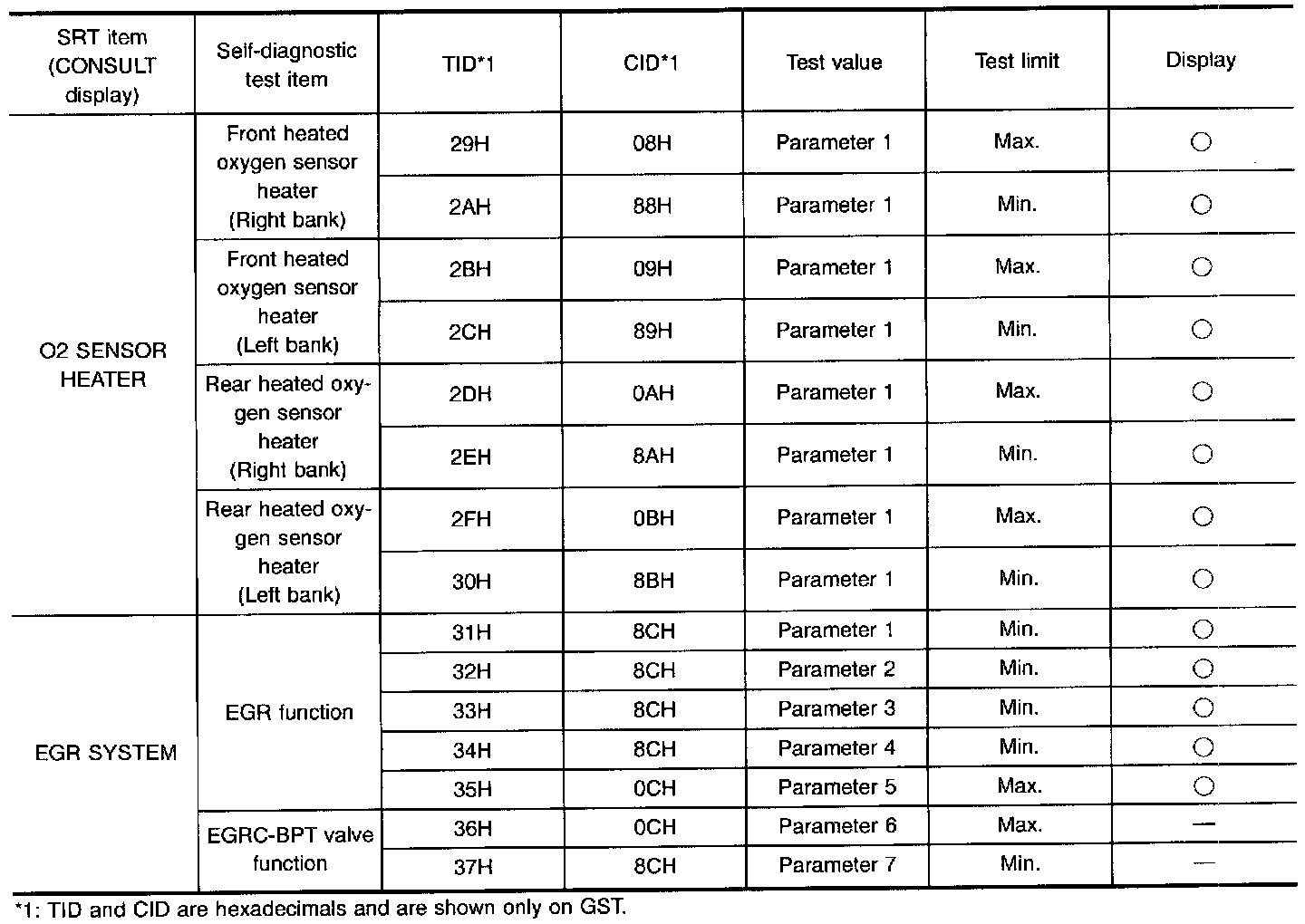 This data (test value and test limit) is specified by Test ID (TID) and Component ID (CID) and can be displayed on the CONSULT screen or GST.