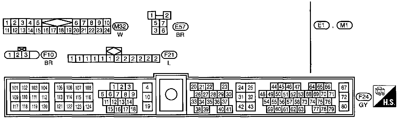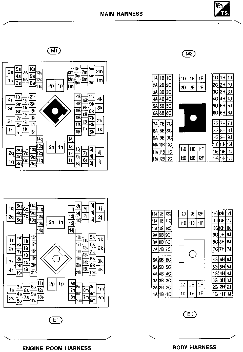 B1, E1, M1, M2 Body, Engine and Main Harness Terminal Arrangements