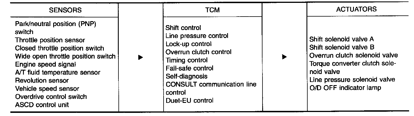 The automatic transaxle senses vehicle operating conditions through various sensors. It always controls the optimum shift position and reduces shifting and lock-up shocks.