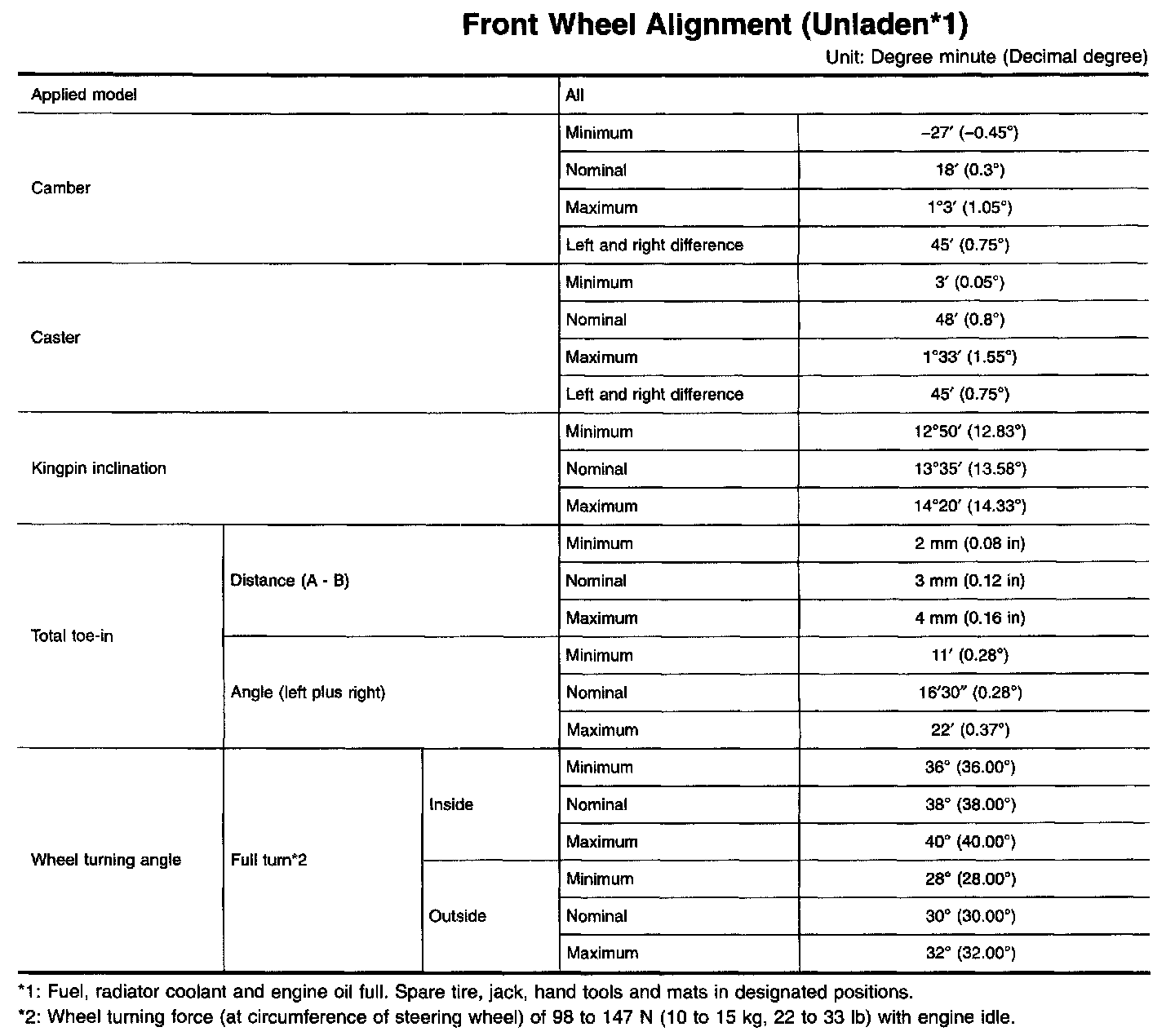FRONT WHEEL ALIGNMENTBefore checking front wheel alignment, be sure to make a preliminary inspection with vehicle unladen*. *: Fuel, radiator coolant and engine oil full. Spare tire, jack, hand tools and mats in designated positions.