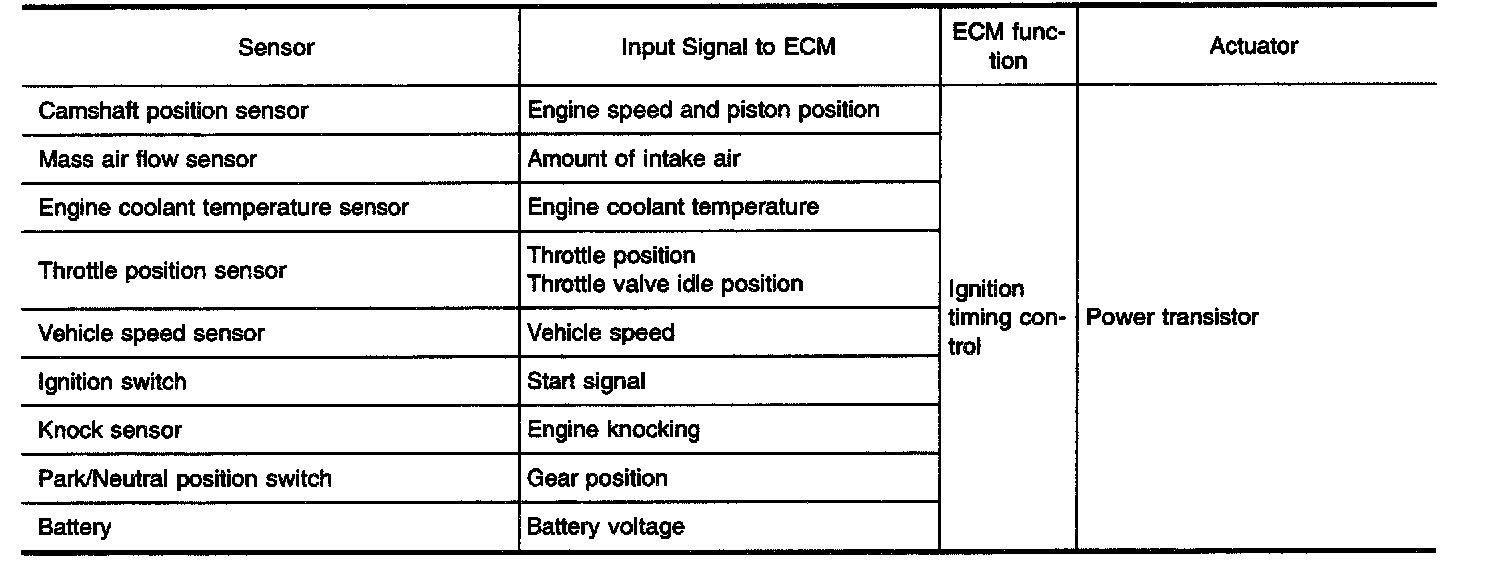 The ECM receives information such as the injection pulse width and camshaft position sensor signal. Computing this information, ignition signals are transmitted to the power transistor.