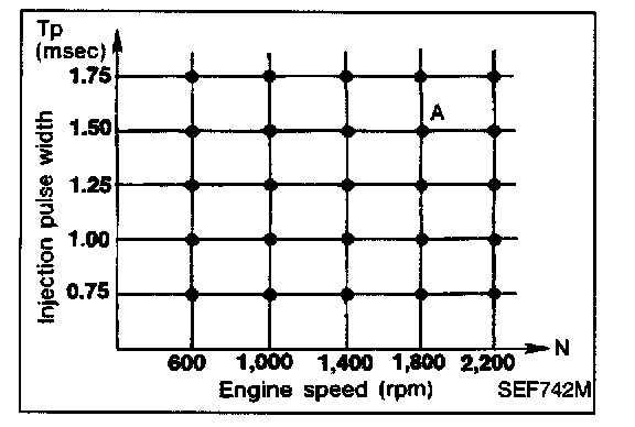 The ignition timing is controlled by the ECM to maintain the best air-fuel ratio for every running condition of the engine. The ignition timing data is stored in the ECM. This data forms the map shown.