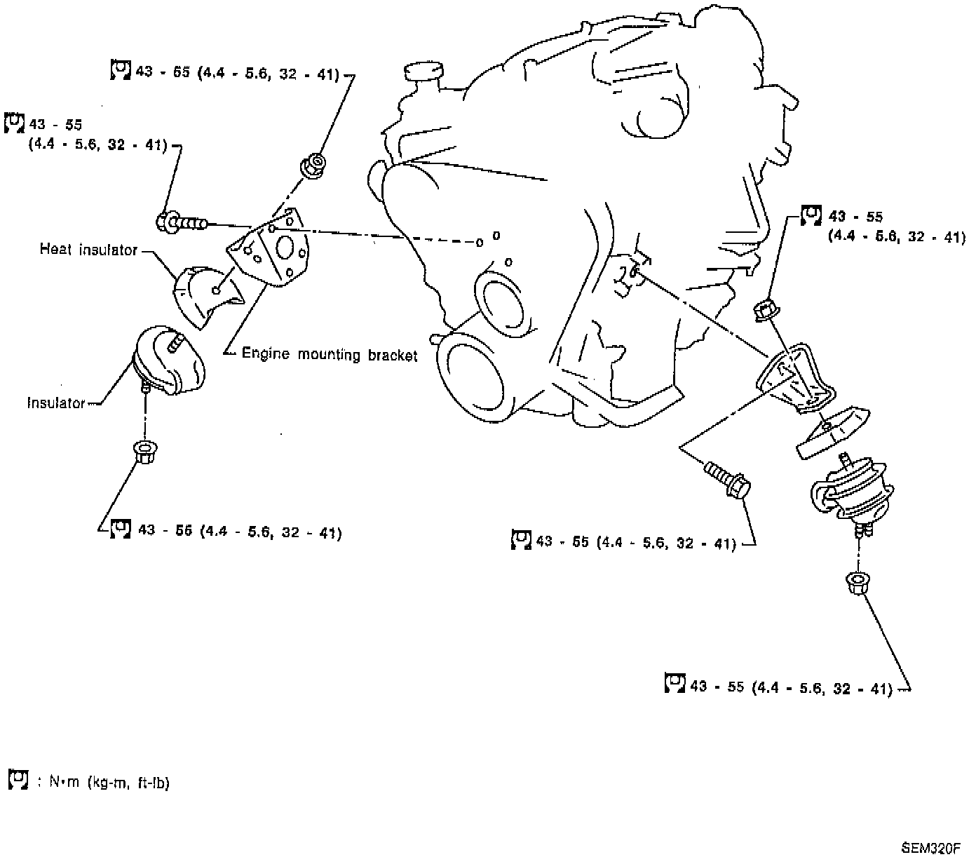 If an angle wrench is not available, tighten nuts to 38 to 44 Nm (3.9 to 4.5 kg-m, 28 to 33 ft. lbs.).